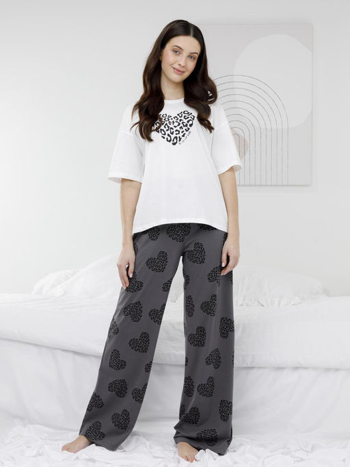 Трикотажная пижама из натурального хлопка для комфортного сна и отдыха. Свободная футболка с короткими рукавами и прямые брюки с мягкой эластичной резинкой в поясе. Гладкий материал приятен к телу, не теряет форму и позволяет коже дышать. Оригинальный принт и набивка выполнены из стойких текстильных гипоаллергенных красителей. Все трикотажные полотна производятся в соответствии с нормами швейцарского сертификата ЭкоТекс.. Состав: Супрем