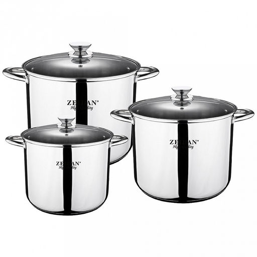 • "Zeidan" Набор кастрюль из нержавеющей стали 3 штуки: 7,5л д22см; 9,5л д24см, 12,0л д26см, стеклянные крышки, 3-х слойное капсулированное индукционное дно, подарочная коробка (Китай) Подходит для всех видов плит, включая индукционную!