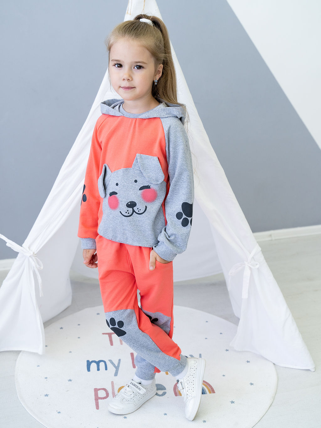 Износостойкий, приятный к телу, плотный трикотаж серого меланжевого и кораллового цветов. Хорошо переносит частые стирки, стойкий к появлению катышков и потёртостей. Спортивный детский костюм. Брюки на резинке в поясе, по бокам карманы. Толстовка с капюшоном, рукавами регланами, спереди аппликация собака. Низ толстовки, пояс брюк, манжеты на рукавах и на штанинах из мягкого трикотажа.