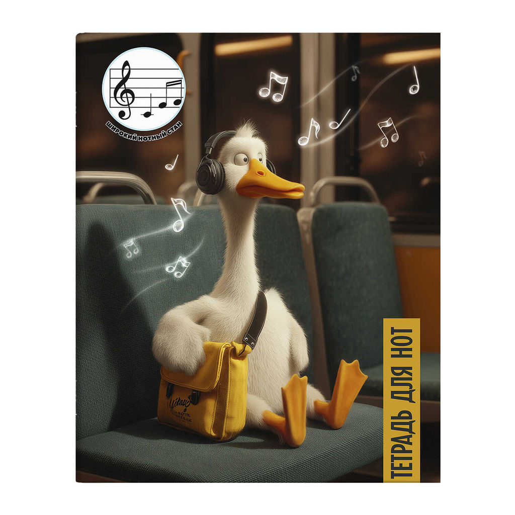 Тетрадь для нот для младших классов 24 л. арт. 73214 ГУСЬ В НАУШНИКАХ /А5+, белый офсет, мягкий переплёт (2 скобы), облож.- мелованный картон 190 г/м?, глянцевая ламинация, глянцевая ламинация. расширенный нотный стан. нет/