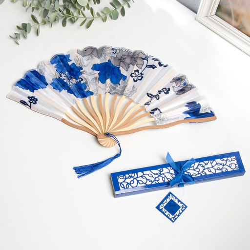 • Веер складной h=21 см изгиб, с кистью Цветы, в коробке, бело-синий