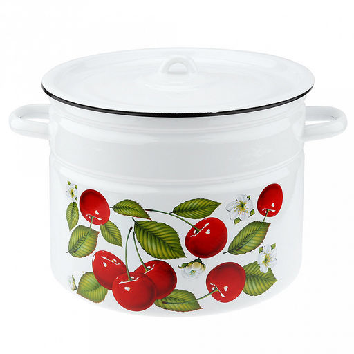 • "Вишня ягоды" Кастрюля эмалированная 9л, д24см, h24см, цилиндрическая форма, металлическая крышка, белый (Россия)