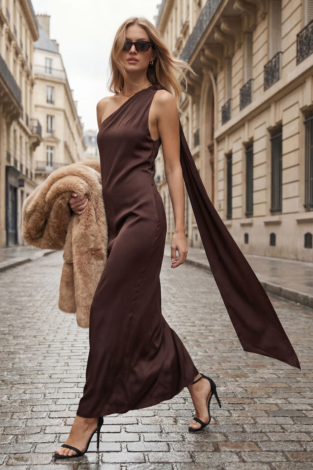 • Kahverengi Dokuma Saten Midi Astars?z Elbise TPRAW26EL00135