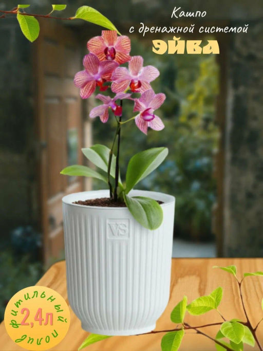 • Горшок цветочный VipSet Эйва 2,4л белый с дренажной системой и фитильным поливом (АМО-2,4-01) /Крассула/