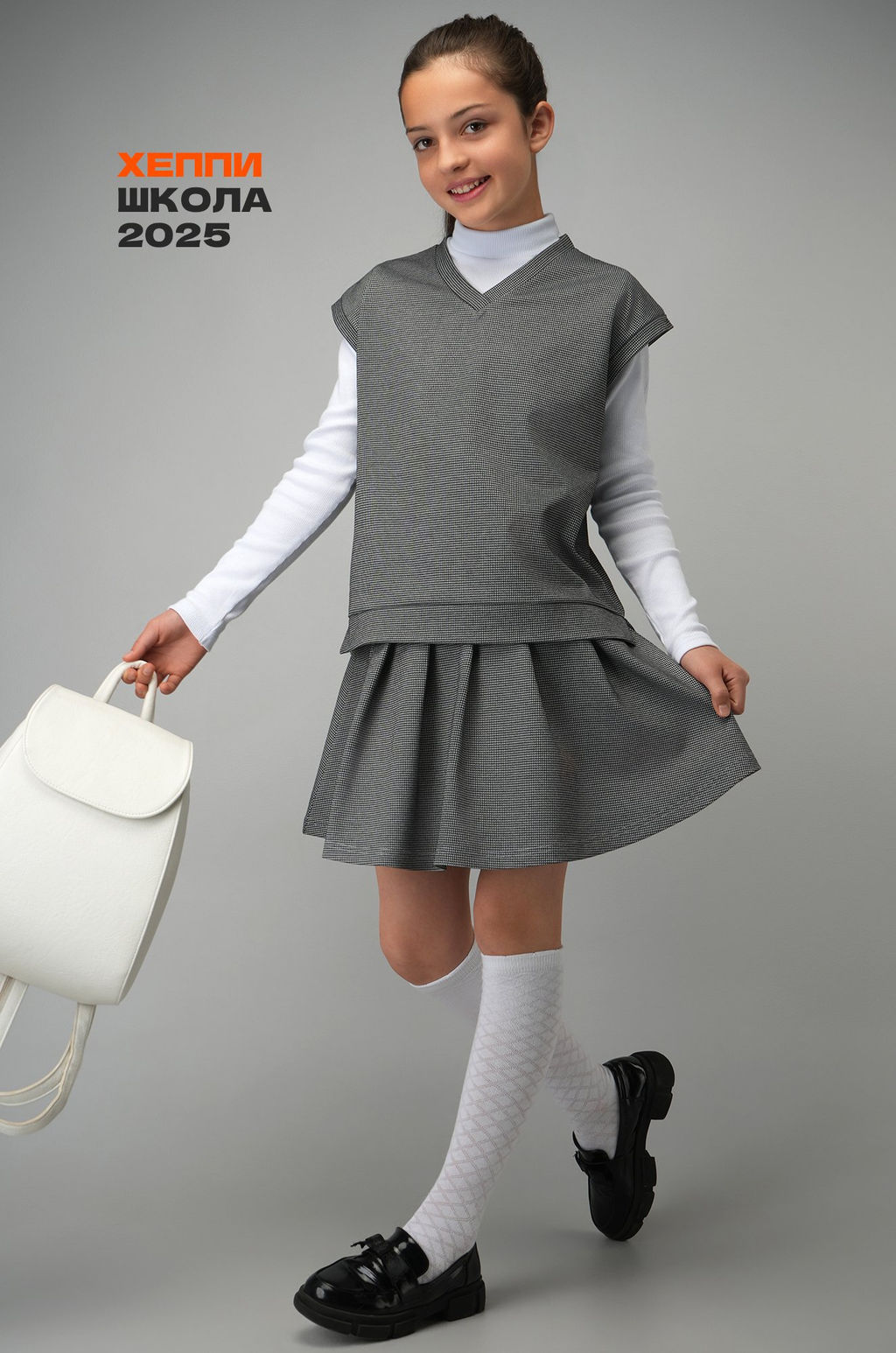 Жилет с V-вырезом и спущенным плечом гармонично сочетается с юбкой до колена, создавая лаконичный и практичный школьный образ. Серый костюм для девочки легко адаптируется под разные случаи от повседневных уроков до торжественных мероприятий.