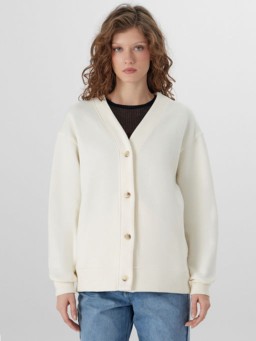 Молочный женский кардиган это нежный акцент для прохладных дней. Он выполнен из мягкого селаника трикотажа с лёгким ворсом, который сохраняет тепло и приятно облегает тело. Свободный прямой силуэт со спущенным плечом и V-образной горловиной создаёт элегантный и расслабленный вид.