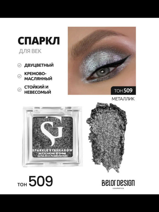 Переливающийся разнодисперсный 3D-глиттер создает на веках тончайшее, одновременно объемное металлическое и дуохромное сияние, зависимо от выбранного оттенка. Создают на веках мерцание, особенно выигрышно смотрится при искусственном освещении.