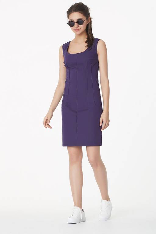 Элегантное платье прилегающего силуэта, выполнено из стрейчевой ткани. Вертикальные линии застрочек зрительно моделируют фигуру. По средней линии спинки выполнена молния. Длина изделия по спинке около 85 см (44 р), около 87 см (48 р).