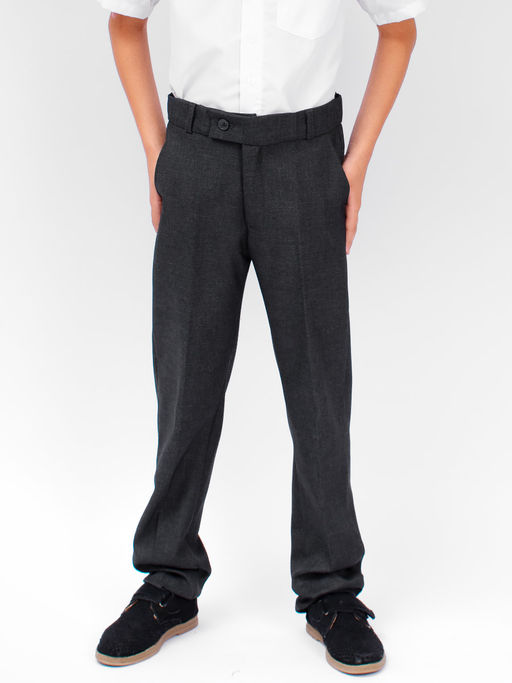 Классические брюки выполнены из высококачественной костюмной ткани. Застежка на молнию и пуговицу, есть шлевки для ремня, удобные боковые карманы, низ брючин не подшит. В пояс вшита резинка для регулировки обхвата талии.
