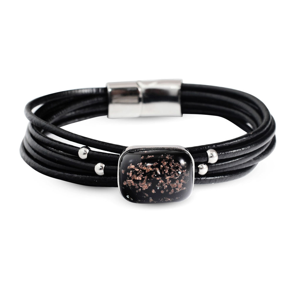 Браслет изготовлен из муранского стекла, натуральной кожи и гипоаллергенной ювелирной стали, что очень важно для людей с чувствительной кожей. Металл не темнеет и не подвергается воздействиям окружающей среды, надолго обеспечивая красивый внешний вид изделия. Крепкий магнитный замок с двойной защитой надежно фиксируется на запястье. Ширина браслета - 1,5 см. Размер стеклянного элемента - 2x1,5 см. Вес - 23 гр.