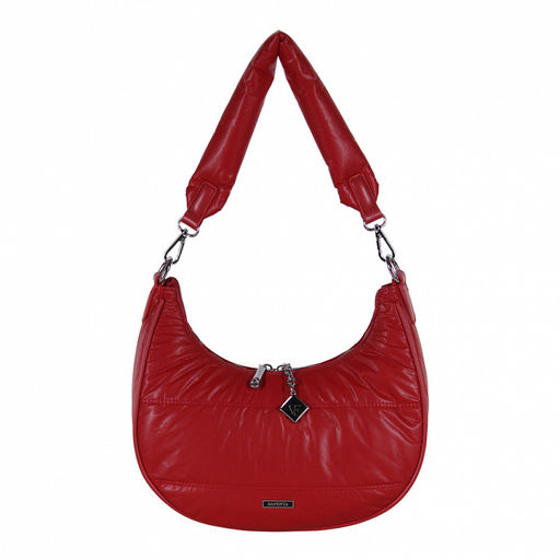 Сумка в форме полумесяц, выполнена из экокожи. Декорирована брелоком. Дополнена серебристой фурнитурой. Данная модель закрывается на молнию, носится в руке за ручку или на плече. В комплекте имеется съемная ручка и плечевой ремень. Каркас мягкий.
