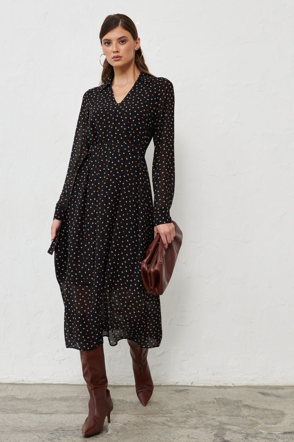 Элегантное платье из шифонового полотна. Модель прямого свободного силуэта, с отложным воротником и V-образным вырезом. Рукав длинный на манжете. В комплекте пояс из основного материала. Изделие на подкладке из стрейч шифона.­