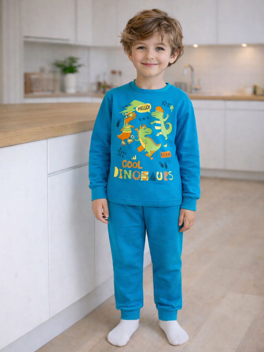 Детская пижама из мягкого футера однотонного цвета из кофты с длинными рукавами и штанишек. Комплект выпускается в однотонном бирюзовом цвете с большим рисунком на свитшоте. Брючки на поясе с резинкой, по низу рукавов и штанин манжеты. Удобно для дома, детской сада и даже прогулок. Мягкий небольшой начес с внутренней стороны. Подходит для мальчиков и девочек. Свободный крой.