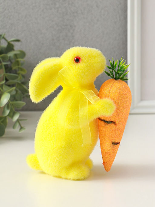 Этот яркий пасхальный заяц с морковкой создаёт весеннее настроение и становится центром праздничного декора. Фигурка выполнена из лёгкого пенопласта с мягким флоковым покрытием, приятным на ощупь. Сочетание солнечно-жёлтого и сочного оранжевого цветов напоминает о первых тёплых лучах и свежих весенних ростках. Универсальный дизайн позволяет украсить праздничный стол, каминную полку или подарить его как милый сувенир, символизирующий обновление и радость. Особенности * Высота фигурки 15,5 см, оптимальна для создания акцента в композиции. * Материал: пенопласт с декоративным флоковым покрытием. * Двухцветное оформление в жёлтых и оранжевых тонах. * Готовое праздничное украшение, не требующее сборки. * Тематика подходит для пасхального оформления и весеннего декора интерьера. Создайте свою пасхальную традицию Пасхальный кролик с морковкой узнаваемый символ праздника, приносящий в дом уют и светлую атмосферу. Благодаря прочным и безопасным материалам фигурка будет радовать вас многие годы, становясь частью семейной коллекции весенних украшений. Она легко комбинируется с другими элементами декора, скатертями и посудой, завершая образ праздничного пространства.