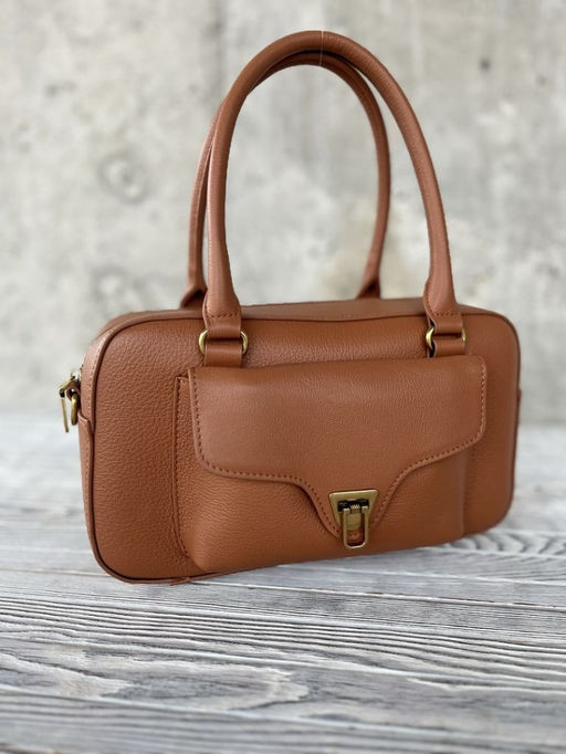 Женская сумка бочонок из натуральной мягкой кожи рыжего цвета, с золотистой фурнитурой.