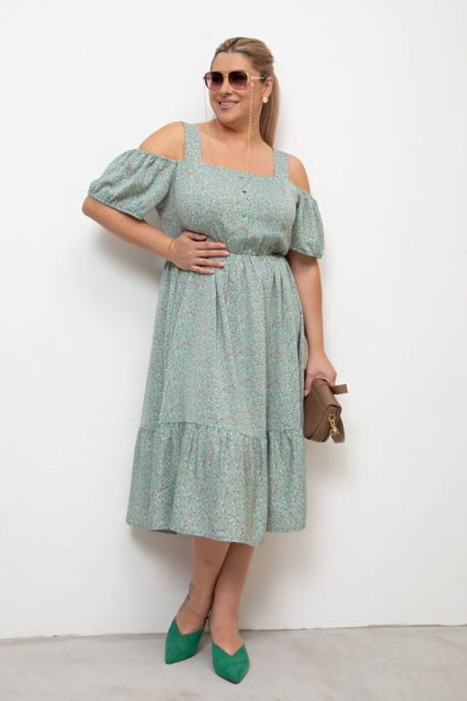 Женственное платье прилегающего силуэта  из легкой плательной ткани в нежный принт. Талия на резинке. Верх  с открытой линией плеча, дополнен широкими бретелями. Центр переда с имитацией застежки на пуговицы. Рукава свободные укороченные, присобраны на резинку. Низ изделия дополнен  широкой оборкой. Отличный выбор для комфортных летних прогулок.­