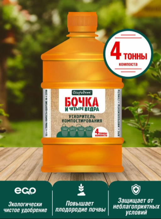 Органоминеральное жидкое удобрение Бочка и четыре ведра подходит для ускоренного формирования компоста из любых органических отходов.