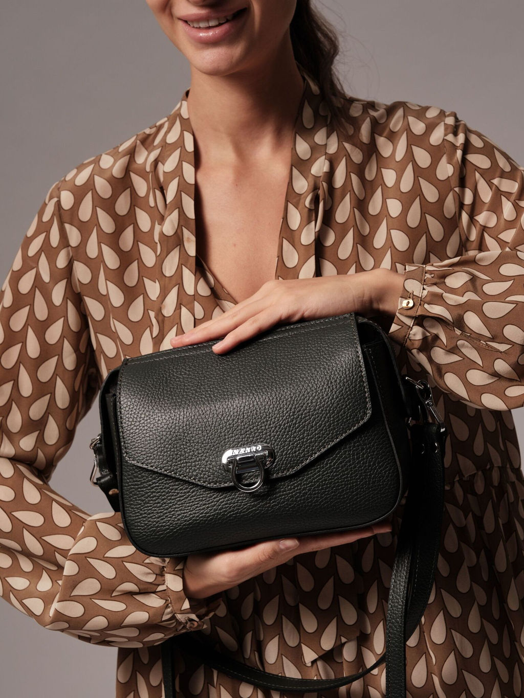 Металлическая фурнитура в холодном серебристом оттенке придает модели современный характер. Стильная застежка одновременно выполняет декоративную и функциональную роль.