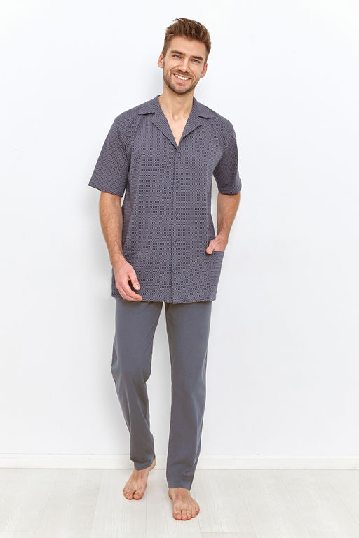 Стильная мужская пижама Simon. Пижама выполнена из качественного и мягкого хлопка, состоит из рубашки с коротким рукавом в клетку и прямых брюк. Пижама очень комфортная и удобная, будет отличной домашней одеждой и замечательным подарком для близких людей.­