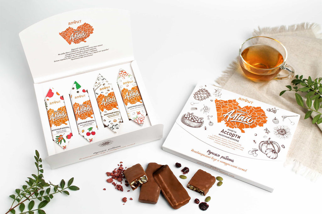 В начинке конфеты - дары природы Алтая. Конфета покрыта вкусным молочным шоколадом.