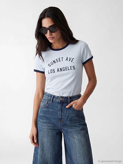Bisiklet Yaka Los Angeles Bask?l? Kad?n Ti??rt