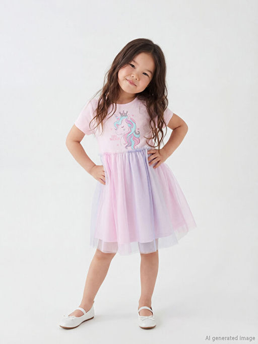 Bisiklet Yaka Bask?l? K?z ?ocuk Prenses Elbisesi