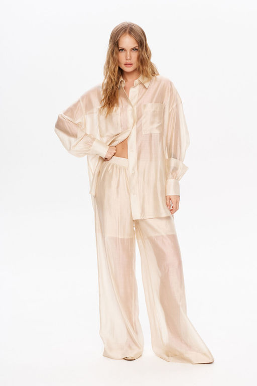Полупрозрачный костюм-двойка из свободной рубашки и широких брюк на резинке.