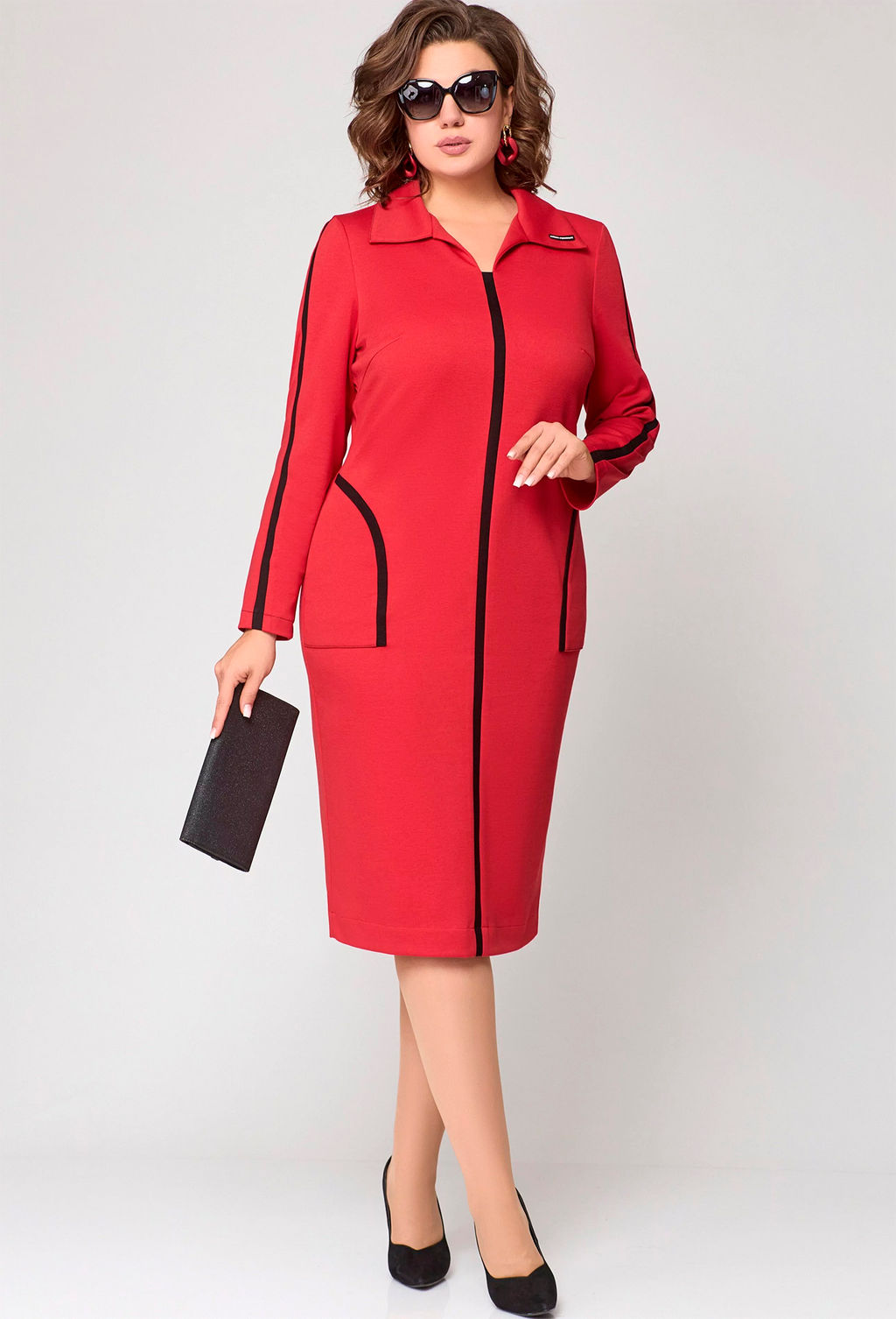 Платье женское нарядно-повседневное прилегающего силуэта, выполнено из трикотажного полотна в сочетании с отделкой. Вырез горловины отложной воротник. По центру переда втачная планка из отделочной ткани, нагрудные выточки и накладные карманы. Рукав втачной, по центру с отделкой.спинка с центральным швом и небольшим разрезом обработанным отделочной тканью. Декором служат детали из отделочной ткани и нашивка на воротнике.