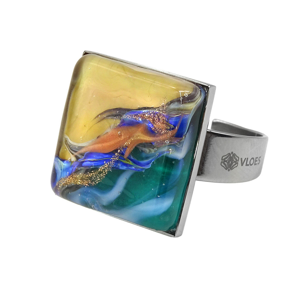 Кольцо изготовлено из муранского стекла и гипоаллергенной ювелирной стали, что очень важно для людей с чувствительной кожей. Металл не темнеет и не подвергается воздействиям окружающей среды, надолго обеспечивая красивый внешний вид изделия. Размер стеклянного элемента - 1,6*1,6 см. Кольцо безразмерное, регулируется с 16 до 19 размера. Вес - 5 гр.