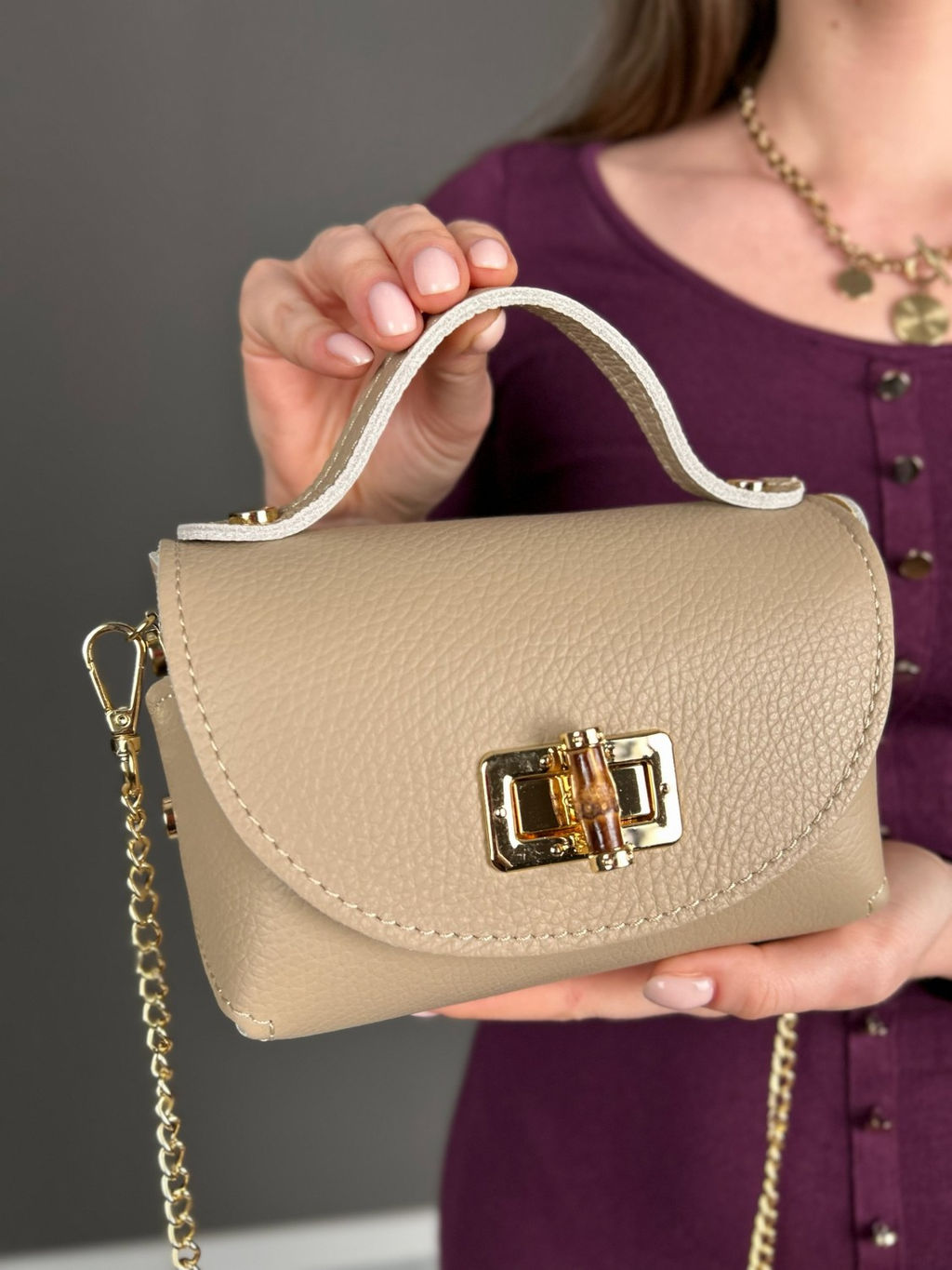 Женская сумка Sefaro из натуральной телячьей кожи, Италия. Миниатюрная модель каркасной лаконичной формы, выполненная из натуральной зернистой кожи высокого качества. Акцентная деталь: элегантная пряжка с вставкой из бамбука.