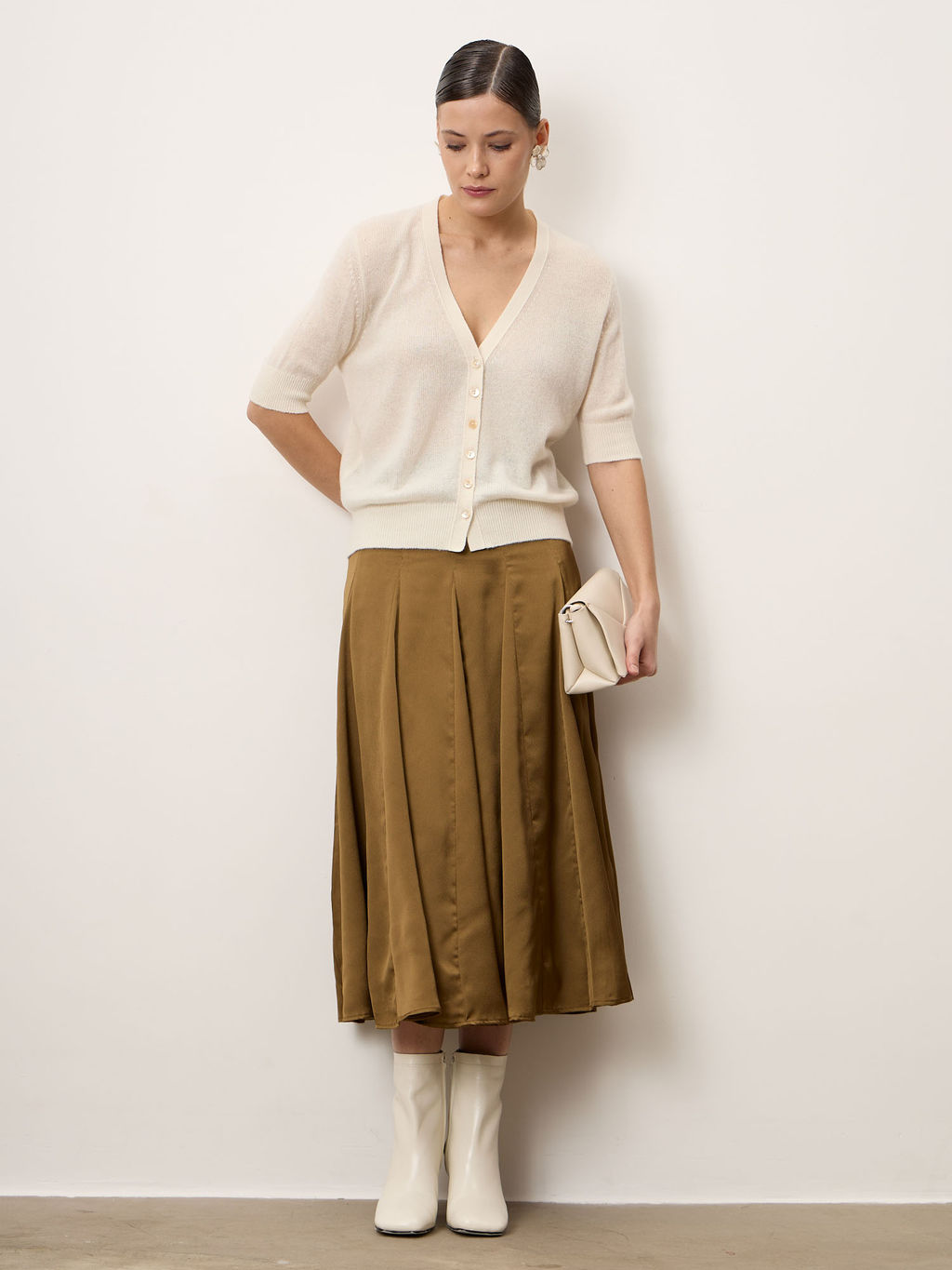 Кремовый светлый, благородный оттенок, подчёркивающий свежесть образа и легко сочетающийся с базовым гардеробом.