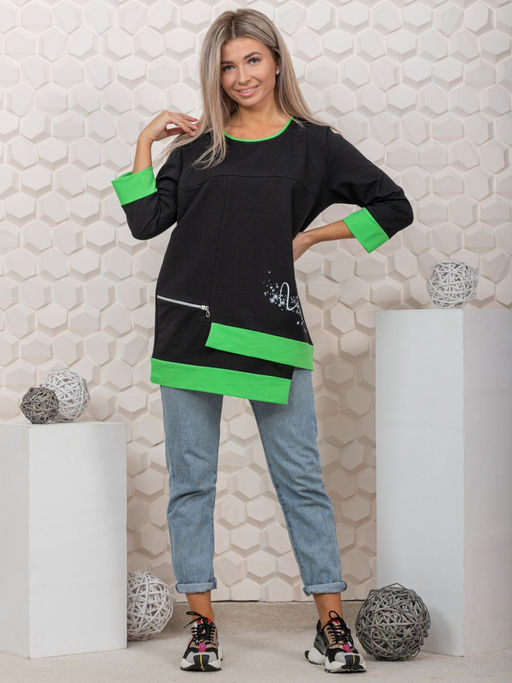 Мягкая туника выполнена из качественного двухниткого футера в стильной расцветке (учтите, что цвет на фото может немного отличаться от реального). Свободный крой обеспечивает комфорт и подходит для любого типа фигуры. Особенности модели: удобные рукава ? длины с манжетами, функциональный карман с молнией с левой стороны, асимметричный низ с декоративной притачной деталью, круглая горловина. Манжеты и низ обработаны контрастной тканью для стильного акцента.