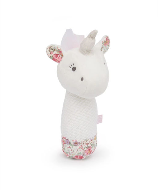 Эту милую игрушку-пищалку очень удобно держать маленькими ручками. Пищащие звуки, издаваемые волшебным единорогом, знакомят малыша с понятием причины и следствия.