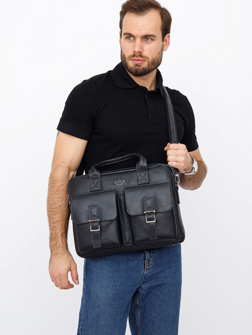 Мужской портфель выполнен из натуральной кожи. Дополнен  фурнитурой темное серебро. Данная модель закрывается на молнии. Каркас полужесткий. Носится в руке за встроенные ручки или на плече. В комплекте имеется съемный ремень.