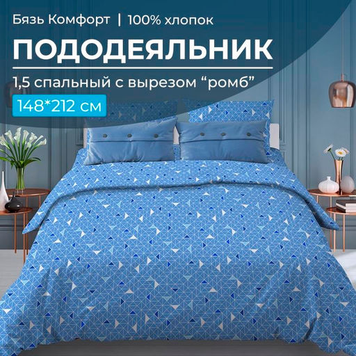 Артикул: Пододеяльник 1,5-спальный, с вырезом "ромб", бязь "Комфорт" (Треугольники, светло-синий)