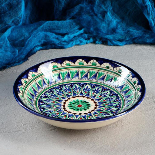 Посуда с национальной росписью станет отменным подарком для ценителей высокородной посуды.Риштан — город на востоке Узбекистана, один из древнейших в Ферганской долине. С давних времён Риштан славится своим гончарным искусством изготовления цветной керамики. Красноватую глину для изделия добывают в самом городе. Мастера утверждают, что их глина настолько высокого качества, что даже не нуждается в предварительной обработке. Дополните коллекцию кухонных аксессуаров пряными восточными нотами.Все товары производства Узбекистан. Набор: Нет. Форма: Круглая. Диаметр, см: 20. Объём, мл: 500. Тематика: Узоры. Рисунок: Да. Вид тарелки: Глубокая. Можно мыть в посудомоечной машине: Нет. Можно использовать в СВЧ-печи: Да. Текстура: Гладкая. Особенности: Без особенностей. Для горячего: Да. Бесплатная доставка: Да. Примечание: Ручная работа, рисунок может отличаться от фото. Примечание: Изделие нельзя мыть в посудомоечной машине. Примечание: Выбор конкретных цветов и моделей не предоставляется. На фотографиях могут быть представлены не все варианты..