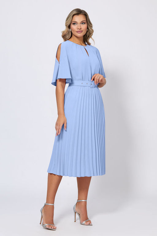 Элегантное и стильное платье с летящей плиссированной юбкой и рукавами-крылышками с кристаллами создает нежный и романтичный образ для торжественных случаев. Модель с округлой формой горловины со сборкой и каплевидной застёжкой на навесную петлю и ювелирную пуговицу по переду. Платье со скрытой резинкой на талии выполнили из приятной немнущейся ткани. Линия талии дополнительно красиво подчёркивается с помощью пояса-ремня с пряжкой в тон.­