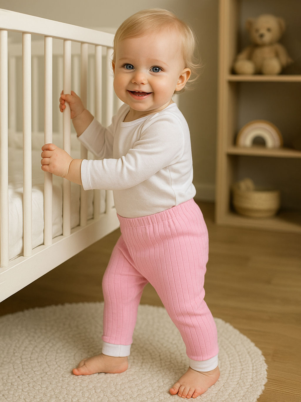 Детские домашние штанишки из однотонного розового интерлока для малышей. Пояс подогнут и вставлена резиночка, которую можно отрегулировать. По низу трикотажные эластичные мягкие манжеты контрастного белого цвета. Подходят для повседневной носки.
