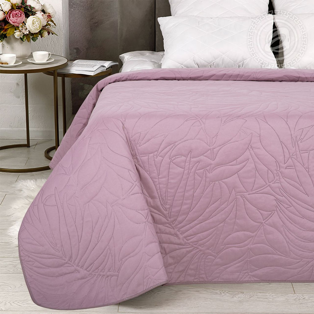 Благодаря создающей фактуру  термоскрепленной стежке, покрывало выглядит как жаккард, создавая в вашем интерьере атмосферу роскоши и элегантности. Полисатин Полиэстер 100% 85 гр./м.кв. Полиэфирное силиконизированное волокно (100% полиэстер) Чехол с кантом