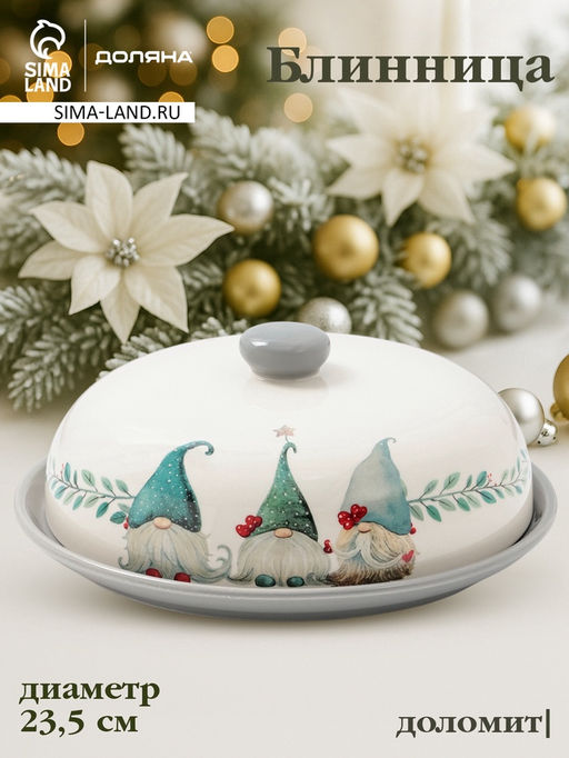 Эта праздничная блинница с крышкой станет уютным дополнением новогоднего стола. В бело-серой блиннице угадывается роспись — домашние гномики создают атмосферу зимней сказки. Диаметр 23.5 см удобен для порционных блинчиков, а натуральный доломит бережно сохраняет тепло.Почему выбирают эту блинницуДоломит с новогодним рисунком — сразу задаёт праздничное настроениеПлотная крышка защищает блюдо от остыванияКлассическая круглая форма подходит для сервировкиЭкологичный доломит без покрытия — естественная текстура материалаДля когоДля тех, кто любит встречать Новый год в семейном кругу с тёплыми традициями. Если вы печёте блины на Рождество или подаёте оладьи гостям — эта блинница добавит уюта вашему ритуалу. Ручная роспись делает её не просто посудой, а зимней историей на вашей кухне. Диаметр, см: 23.5. Тематика: Новогодняя. Рисунок: Да. Крышка: Да. Тематика праздника: Новый год. Можно мыть в посудомоечной машине: Нет. Можно использовать в СВЧ-печи: Нет. Бесплатная доставка: Да. Размеры товара: 23.5/9.7/23.5. Примечание: Оттенок данного товара может незначительно отличаться от фото/видеоизображения (в зависимости от настроек яркости вашего экрана)..