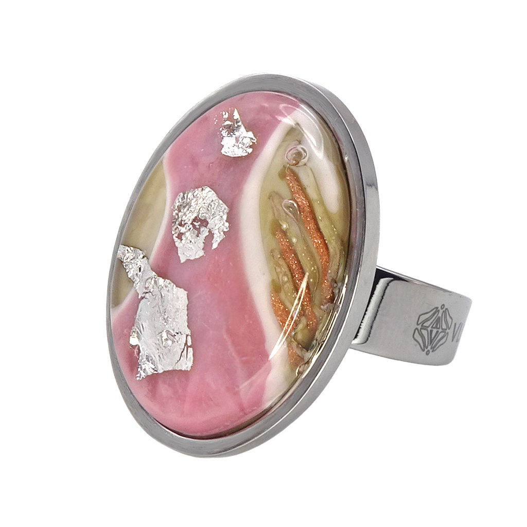 Кольцо изготовлено из муранского стекла и гипоаллергенной ювелирной стали, что очень важно для людей с чувствительной кожей. Металл не темнеет и не подвергается воздействиям окружающей среды, надолго обеспечивая красивый внешний вид изделия. Размер стеклянного элемента - 1,9*2,6 см. Кольцо безразмерное, регулируется с 16 до 19 размера. Вес - 8 гр.