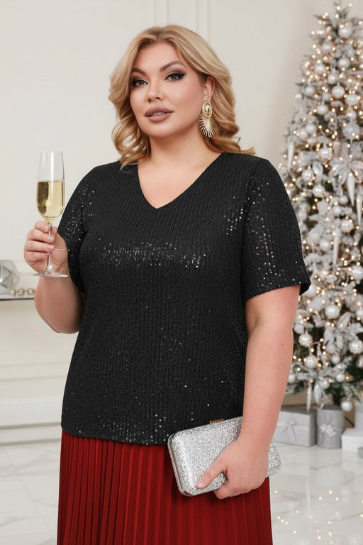 Блузка  прямого кроя из мягкого эластичного материала. Модель имеет V-образный вырез с узким кантом и короткие рукава. Пайетки по всему изделию добавляют образу блеска и изящества. Полуприлегающий силуэт искусно обыгрывает фигуру и не сковывает движений. Модель легко сочетается с любым низом, поэтому скомбинировать чудесный и стильный образ с юбками,  легинсами, брюками не составит труда.­