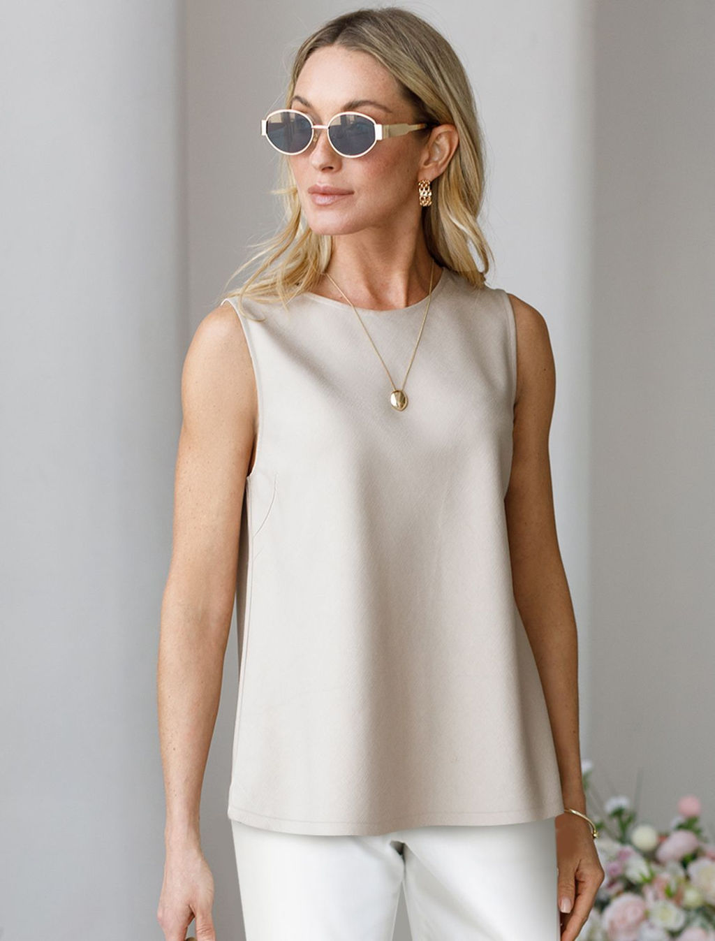 Топ выполнен из плотного лиоцелла. Ткань изделия отлично держит форму, плавно драпируется и не просвечивает. В теплое время года приятно охлаждает кожу. Добавление синтетических волокон в составе изделия, предотвращает сминаемостьи поддерживает формоустойчивость. Топ сочетается в костюме с брюками D24.261, D24.265, D24.267, юбкой D24.261, шортами D28.057, а также очень эффектно с белыми шортами и джинсами.­