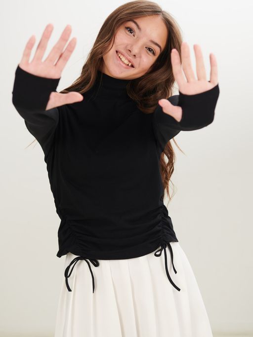 Водолазка прилегающего кроя из вязанного полотна, высокий воротник , длинные рукава с отверстием для большого пальца. Состав:92% хлопок, 8% лайкра