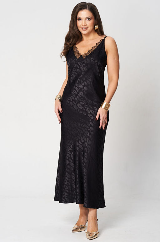 Длинное платье- комбинация, приталенного силуэта на регулируемых бретелях. Перед с фигурными подрезами подчеркивающими линию груди. Отделкой является французское кружево вдоль линии горловины. Платье косого кроя, на мягкой эластичной на подкладке.­