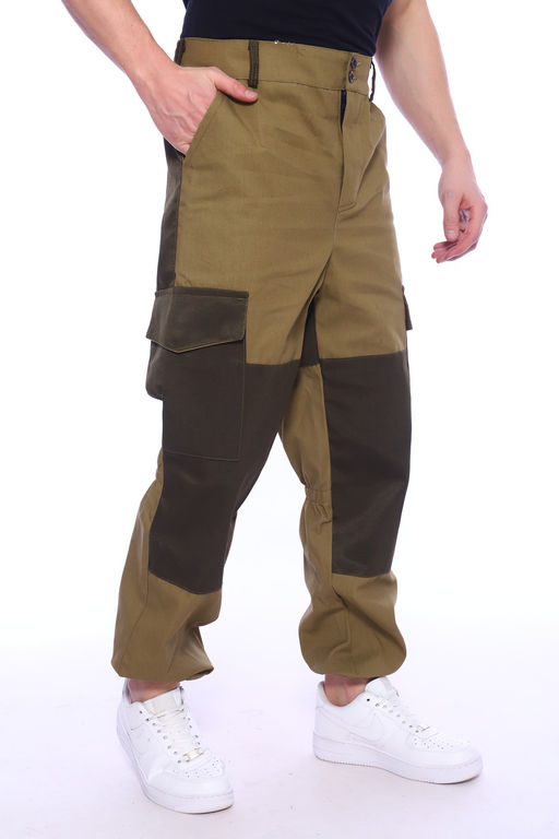 Брюки горка мужские тактические летние – универсальная спецодежда. Удобная спортивная одежда для любого вида активного отдыха и работы. Модель выполнена из качественного хлопкового полотна: палаточное полотно (100% хлопок) цвета хаки. Материал прочный и износостойкий плотностью 240 гр/м2, хорошо держит форму и не растягивается. Не склонен к образованию катышек, не линяет. Для предотвращения быстрого истирания основные проблемные места усилены дополнительным слоем ткани плотностью 215 гр/м2 с содержанием полиэстера 65%. Изделие рекомендуется стирать на деликатном режиме при температуре не выше 30С во избежание усадки. Брюки с высокой талией с поясом, застегивающимся на две пуговицы, снабженным резинкой и шлевками под широкий ремень. Гульф на молнии. Тактические штаны свободного кроя, не сковывают движений и подойдут для любого типа фигуры. Летние штаны снабжены двумя типами карманов: два боковых прорезных кармана и два накладных по бокам с застежкой на кнопку. В низки брючин вшита резинка, которая препятствует попаданию под штанины ветов, или сухой колючей травы. Так же могут быть использованы в качестве джоггеров.