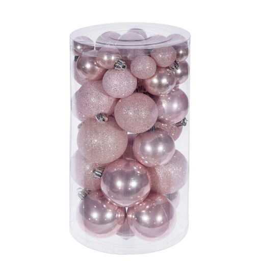 Набор из 40 шаров разного диаметра розового цвета. В наборе 10 шаров диаметром 6см (5 перламутровых и 5 с глиттером),10 шаров размером 5см (5 перламутровых и 5 с глиттером),10 шаров размером 4см (5 перламутровых и 5 с глиттером) и 10 шаров размером 3см (5 перламутровых и 5 с глиттером). Упакованы в тубу размером 14*14*26 см