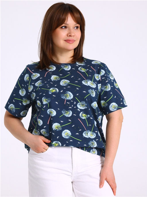 футболка,хлопок 92% + лайкра 8%,кулир с лайкрой / хлопок 92% + лайкра 8%,- / одуванчики с пушинками на темно-синем / - / - / - / -,Футболка выполнена из кулира - легкого хлопкового набивного полотна с лайкрой. Изделие свободного покроя с короткими рукавами и круглым вырезом горловины. Уход: только машинная стирка (руками не стирать!) при температуре 40 градусов, без предварительного замачивания.