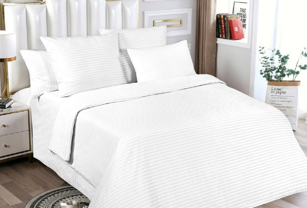 Комплект выполнен из ткани поплин плотностью 110-115 г/кв.м, 100% хлопок, благодаря рисунку полоса, комплект прекрасно подойдет под любой интерьер