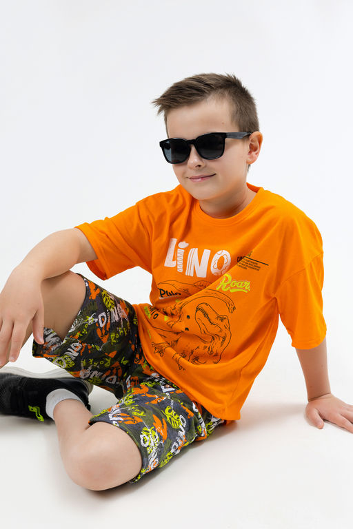 Футболка комплекта представлена в ярко-оранжевой расцветке с изображением динозавров и надписью, привлекающей внимание. Бриджи выполнены в спокойной зеленой гамме и украшены надписью, дублирующей рисунок футболки, создавая гармоничный и стильный образ.
